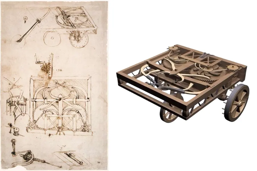 Leonardo created one of the earliest concepts for a self-propelled vehicle. His wooden cart utilized tightly coiled springs for propulsion, accompanied by a steering system designed to guide it.